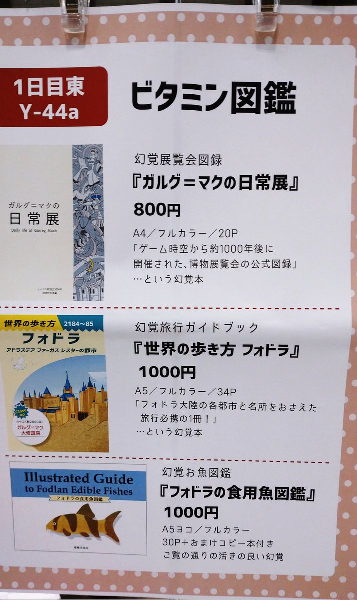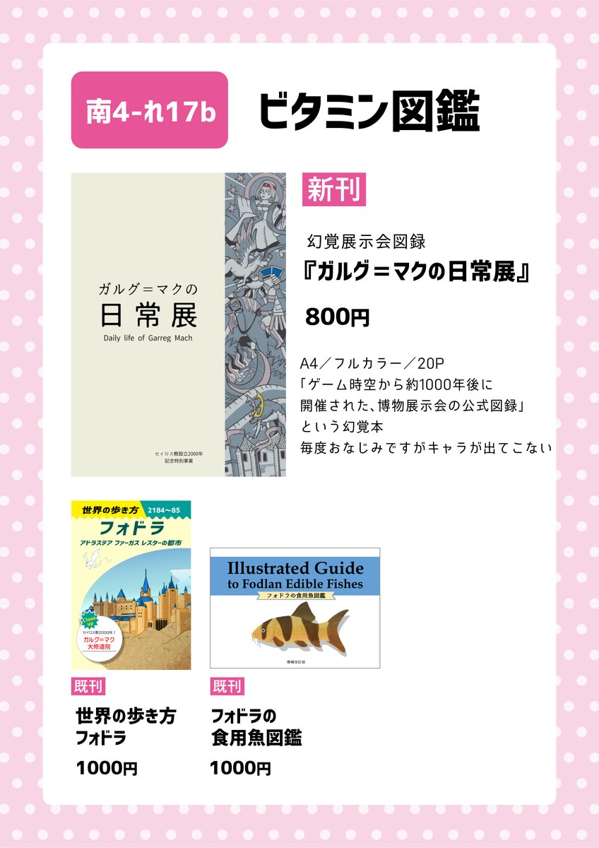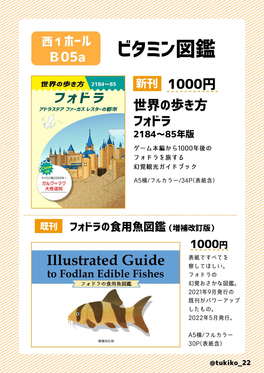 6/26(日)刻印の誇り15(こくほこ)のお品書きです! 西1ホール B05a にてお待ちしております。新刊は『幻覚旅行ガイドブック』、既刊の『幻覚お魚図鑑』も残部持ち込み致します💪crepu.net/board/232133 詳細以下、リプをご確認くださいー。