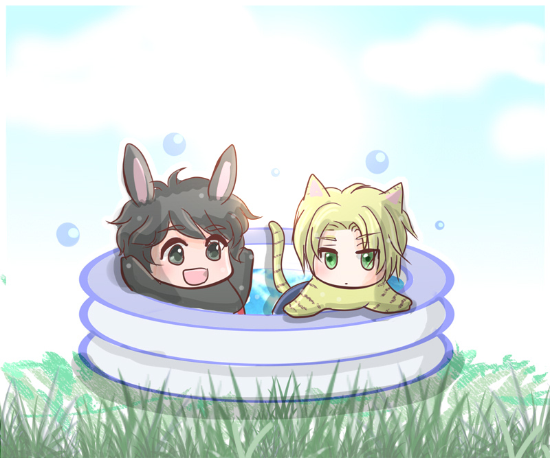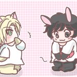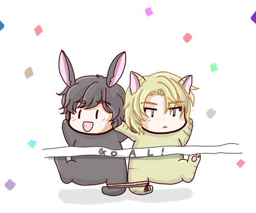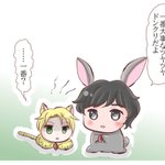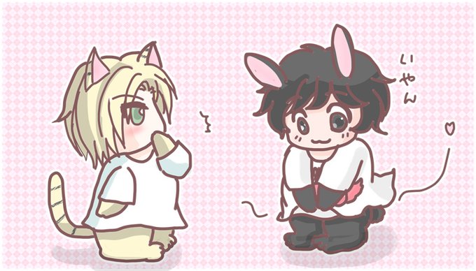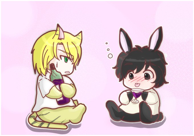 昨晩参加したかったのですが寝落ちで今朝描きました お題【お酒】お借りしました! 🐰「あっしゅ なんでさんにんもいるの~?」 😾「待て 人間の落とし物どんだけ口にした!?」 #A英ワンドロワンライ