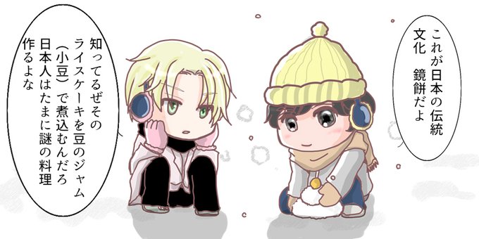 ワンドロ参加したかったのですが本日のお題がどうしても思いつかなかったので前回の鏡餅お借りしました 今日のお題すごくツボなので後日思いついたら改めて参加したいです……!この後「揚げバターなんてことを考える食事文化の人に言われたくない」と言い返す英ちゃん #A英ワンドロワンライ