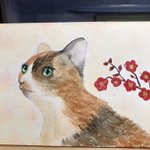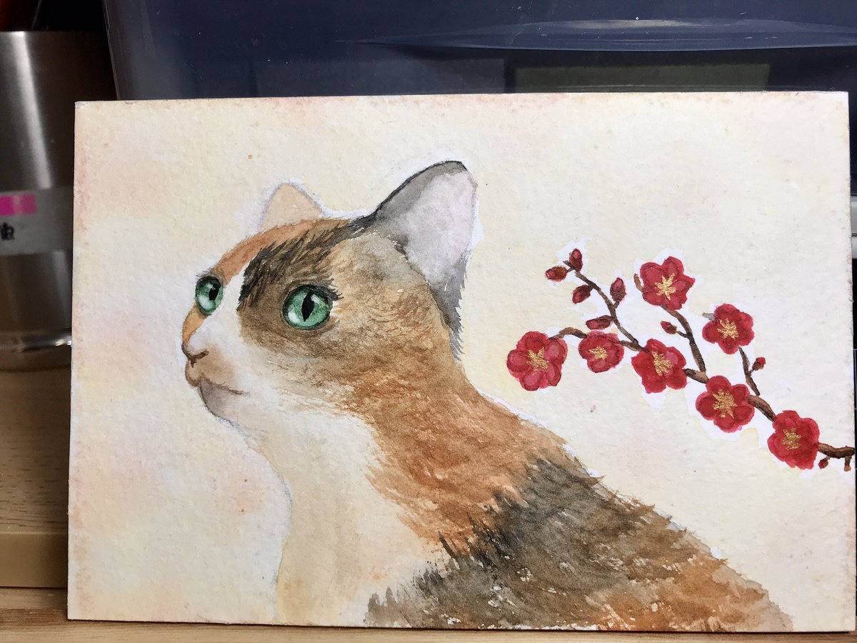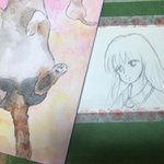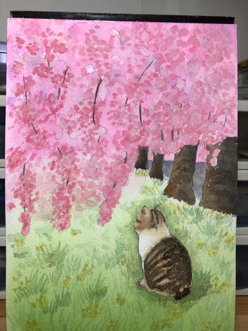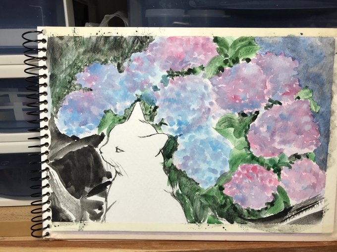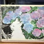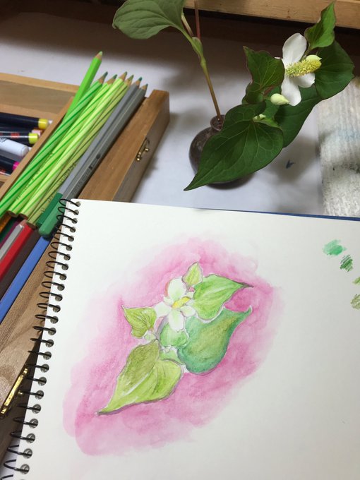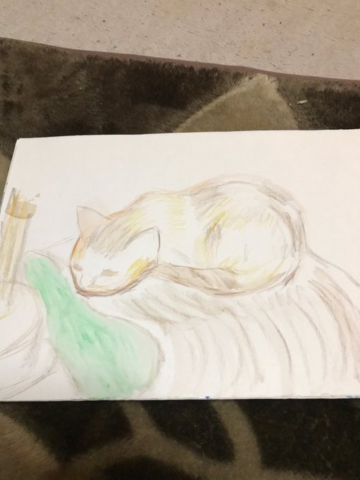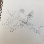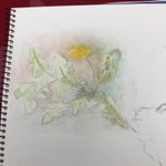 うちの敷地の日陰にひっそり咲いてたタンポポを描きました。薄〜く彩色も。鉛筆の線を練り消しで少し薄くしたんですが黄色は難しい〜すぐ濁る〜😣いつも通り看板娘が邪魔をしに来ました😚 #つらら庵お散歩スケッチ