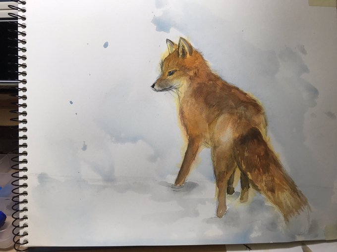 やっぱり私が描くと絵画というよりイラストっぽくなるなぁ〜🧐・・・結局あちこち自分流の描き方しちゃっては勉強にならないですよね〜と、反省して次行ってみよー😆 #雪の中のキツネさん #イラスト #キツネ