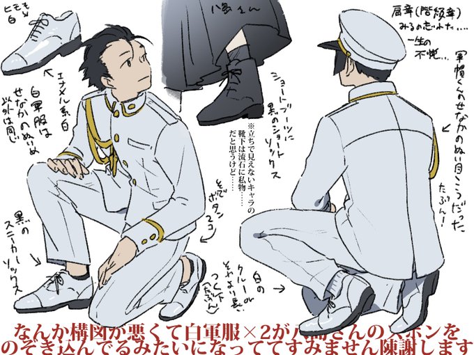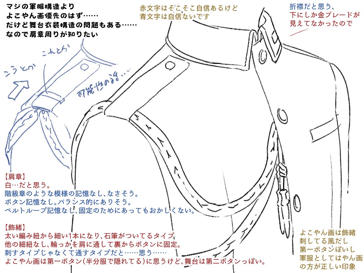 フォロワーによりだいぶ白軍服(というより学生服なのか?)の構造解像度上がった 襟まわりまだ若干あやしいけど肩章ないでよさそうだから結構……謎構造だな……