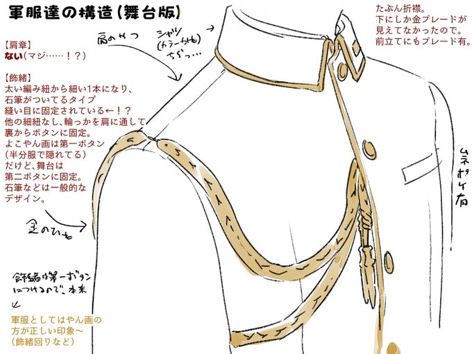 210 481 フォロワーによりだいぶ白軍服(というより学生服なのか?)の構造解像度上がった 襟まわりまだ若干あやしいけど肩章ないでよさそうだから結構……謎構造だな…… 23/05/15 01:21