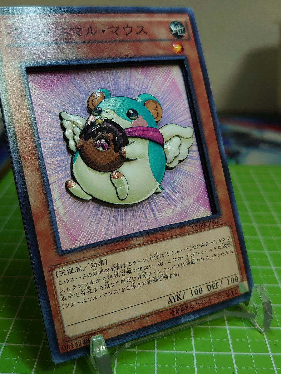 完成.。゚+.(・∀・)゚+.゚ ファーニマル・マウス 作りかけだったものを完成させました(*´Δ`*) ドーナツを持つ手が上手くいったと思う。ドーナツもチョココーティングをレジンで表現出来たかな? #シャドーボックス #遊戯王