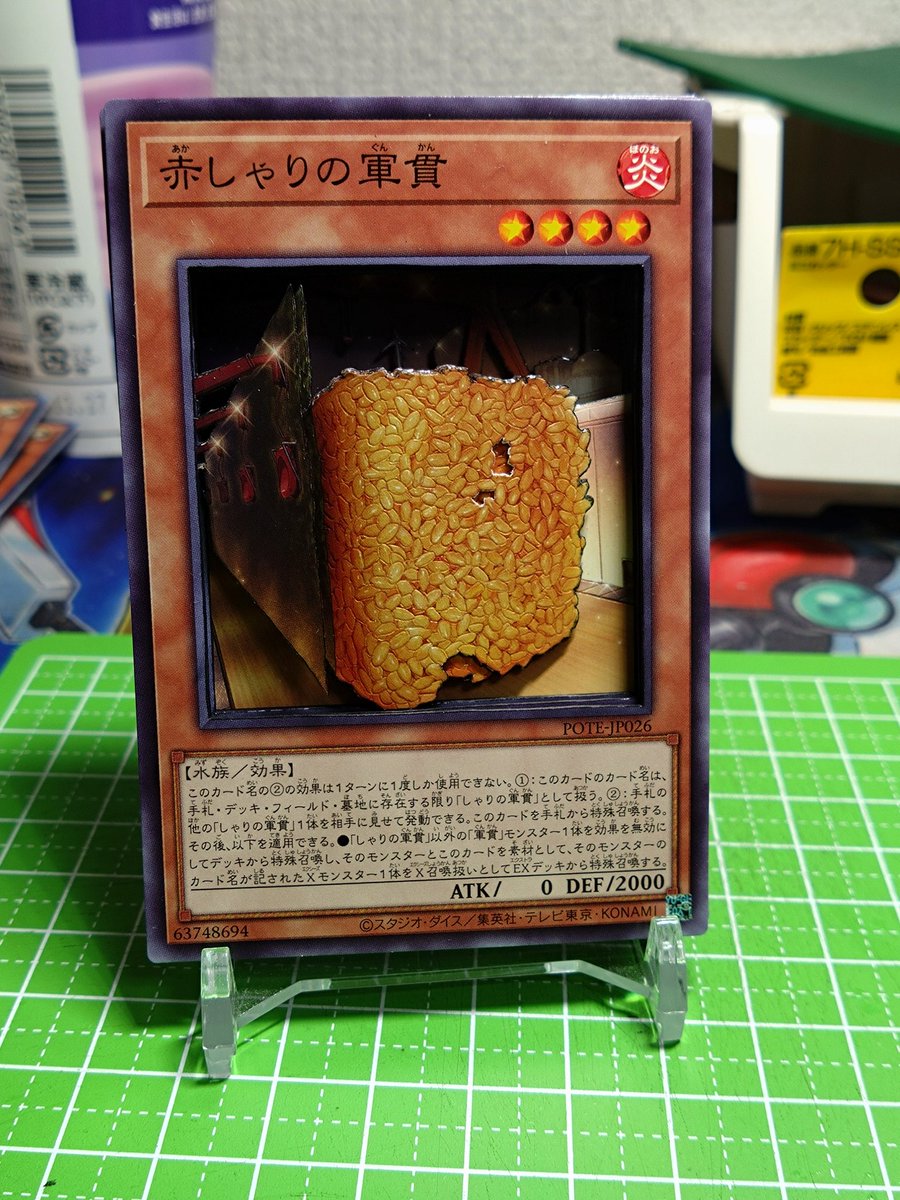 2 9 完成+.(≧∀≦)゚+.゚ 遊戯王より 赤しゃりの軍貫 米粒を1つずつ分割すると、時間と枚数が足りなくなりそうだったので筋彫りしてみました( ´ ▽ ` ) 所々断面塗ってないですが、塗ると変になりそうだったので悩みましたがそのままにしてみた( ・ω・ ) #シャドーボックス #遊戯王 #けろんた杯 22/12/29 23:07