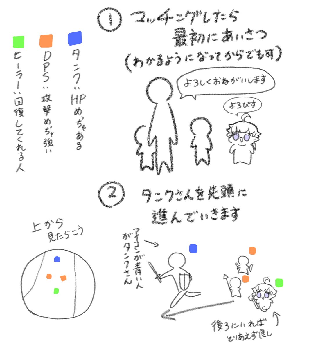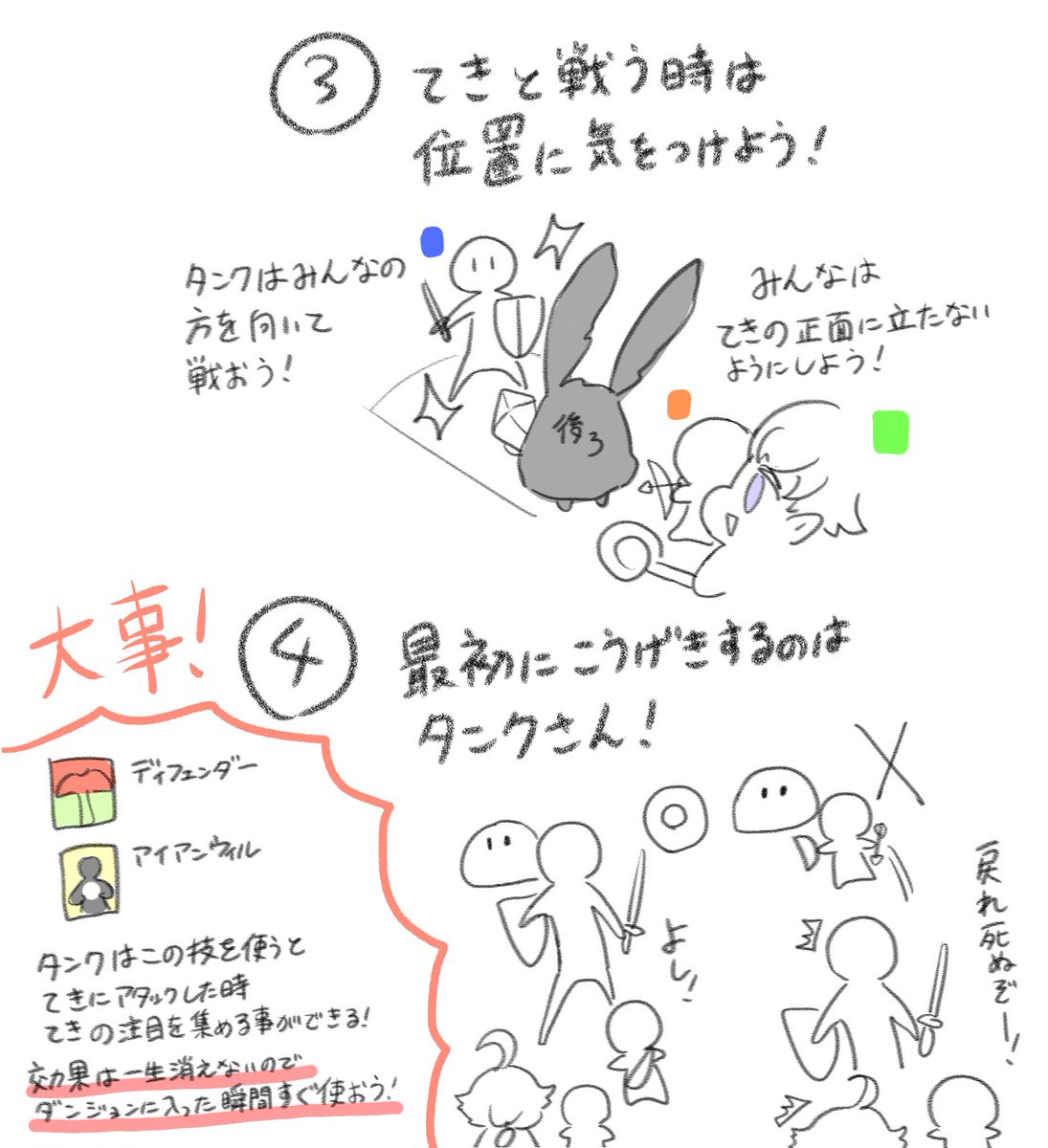新規さん増えたから描いた!! これで最初のダンジョンもへっちゃらよー!! みんながんばれ〜!! #FF14初心者