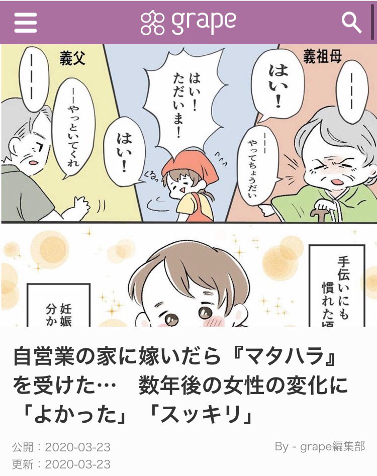 2 6 grape様に漫画を 記事化して頂きました🎉 マタハラに悩んでいる方 義実家と闘っている方に 読んで貰えると嬉しいです😌♡ grapee.jp/803575 #拡散希望 #育児漫画 20/03/23 20:39
