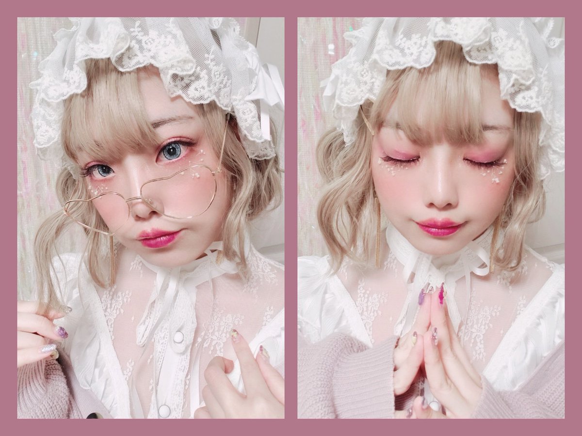 7 56 #貰った要素で創作宅コス ぱーと② メガネ、レース、 明るい髪色、ピンク系メイク 白色、ろりぃた、ニット 前半とちがいすぎる🦄💭🌈💜 20/04/26 23:48