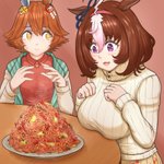 おいしい焼きそばがあるとドトウに誘われて付いて行ったらゴルシ特製の激辛ディアボロ焼きそばだった…🥺 #ウマ娘 #マチカネフクキタル #メイショウドトウ
