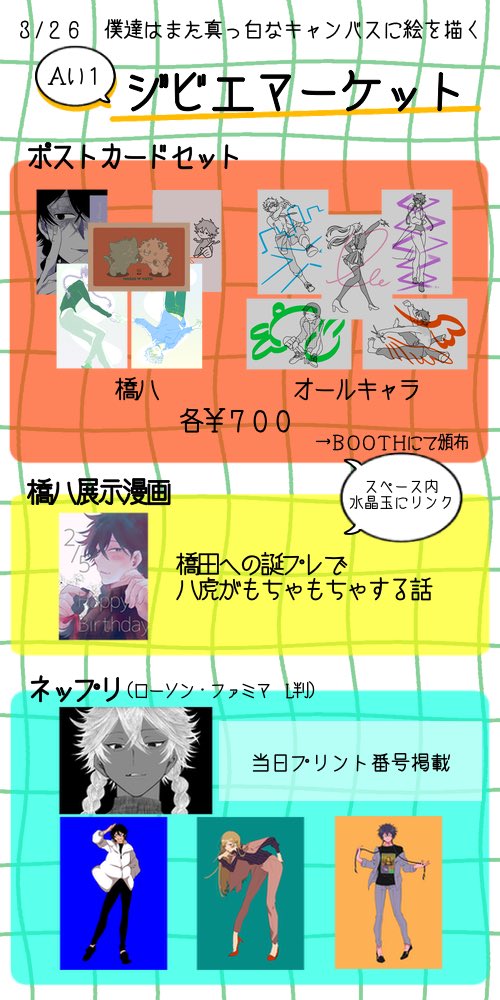 7 28 #僕達はまた真っ白なキャンバスに絵を描く ジビエマーケット【A:い1】 当日のお品書き!です! ・ポスカセット2種(BOOTHにて通販) ・展示漫画(Pixivにて公開予定) ・ネップリ4種 こちらの3本立てになります〜 よろしくお願いします🙇♀️ 22/03/23 23:43