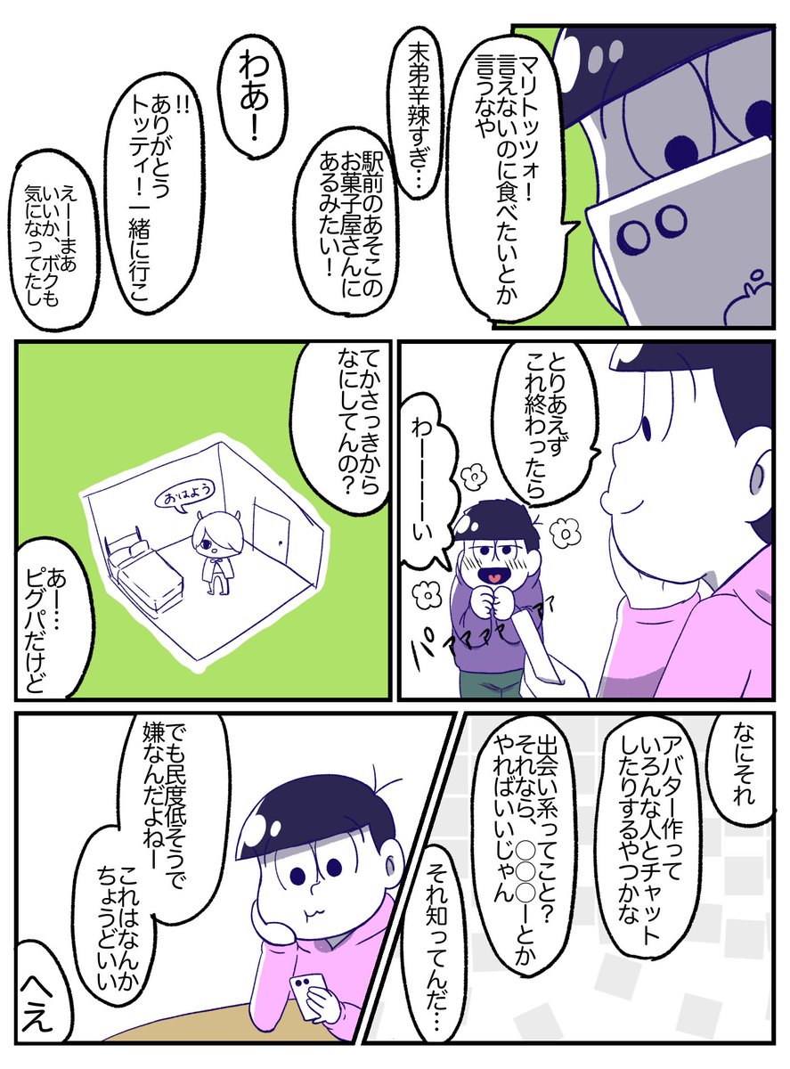 マシュマロお題から 「マリトッツォ言えない一松」 「出会い系アプリは嫌だけど出会いがあると聞いてピグパ始めるトド松」