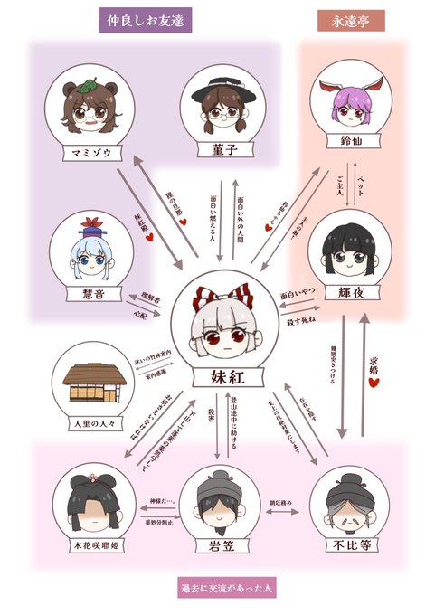 妹紅本に載せた妹紅相関図。 お前…登場当初と比べて、友達増えたな…。
