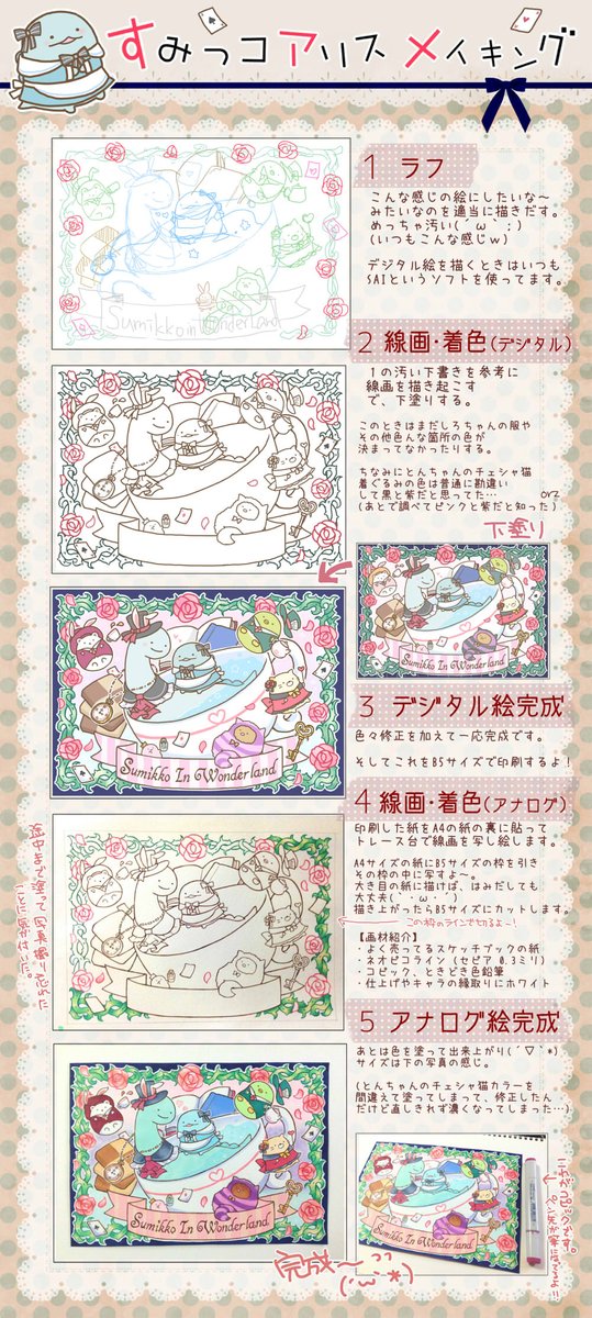 79 273 不思議の国のすみっコたちー!(´□`*) 1枚目はデジタル絵、2枚目はアナログ絵、3枚目はこのイラストのちょっとしたメイキングです! #すみっコぐらし 16/07/06 20:06