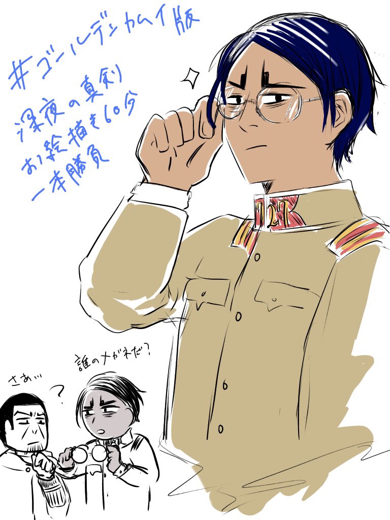 7 33 #ゴールデンカムイ版深夜の真剣お絵描き60分一本勝負 お題:自由 長谷川幸一氏の眼鏡を鯉登少尉にかけてもらいました👓 一時間、、むずかしい、、、! 19/06/29 23:04