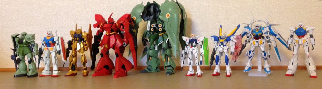 0 3 #ガンプラ 宇宙世紀のmsを(おおまかな)年代別に作ろう作戦完遂! 大きさの推移が面白いですね クシャトリヤとf91の大きさの差がすごいし、ターンエーが案外でかい こっからは抜けた年代のや、アナザーを作っていくぞー 20/05/06 11:43