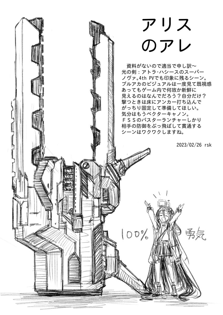 イベントで出したアリスちゃんペーパーと ずっと忙しすぎて落書きすらままならない落書き。 ベクターキャノンもそうだけどどちらかというと 紅殻のパンドラに近いかもしれない。 #ブルアカ