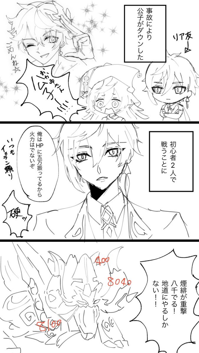 深夜の3人マルチらくがき おかゆさんとリア友と行った若陀龍王戦の実録です 2人初心者なのでダメージとか編成とか細かいとこは目を瞑ってください( ¨̮ ) #原神