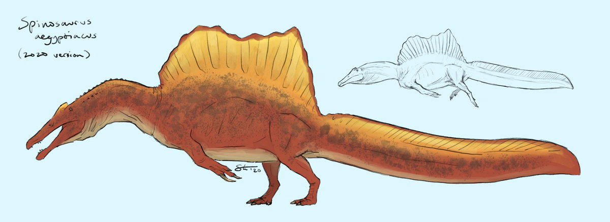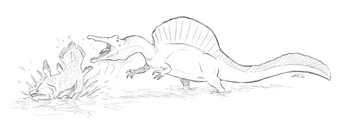 Here’s a #Spinosaurus struggling with a Mawsonia that I sketched last year after reading @TomHoltzPaleo and @Dave_Hone’s paper on it. Worth sharing again with the latest news on the animal. Proportions based on @skeletaldrawing’s reconstruction. #paleoart #sciart