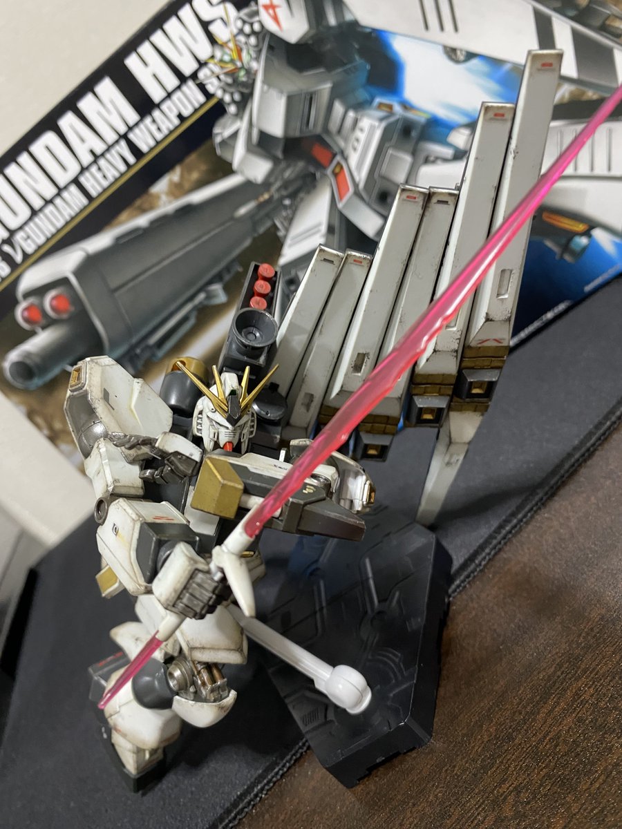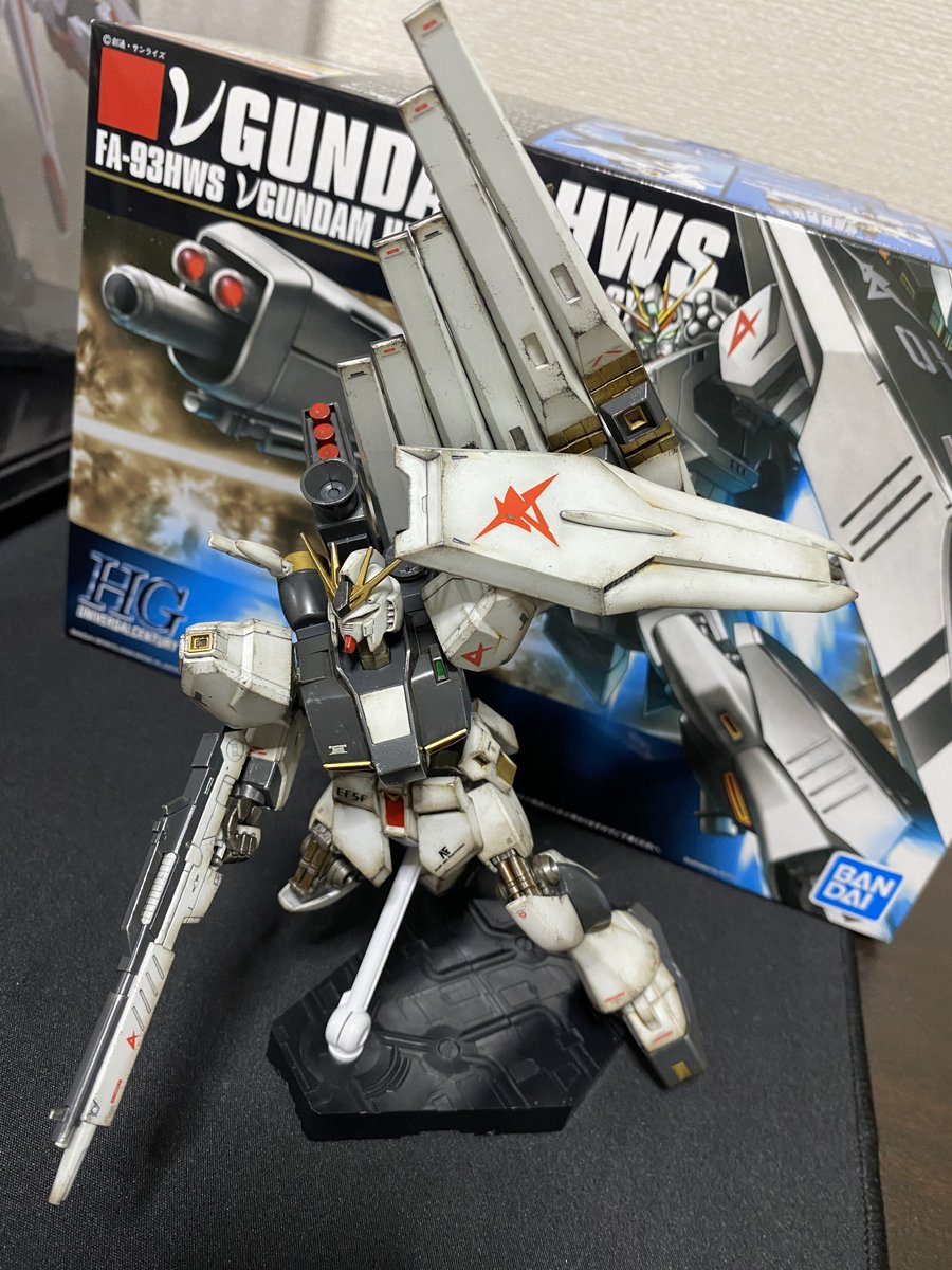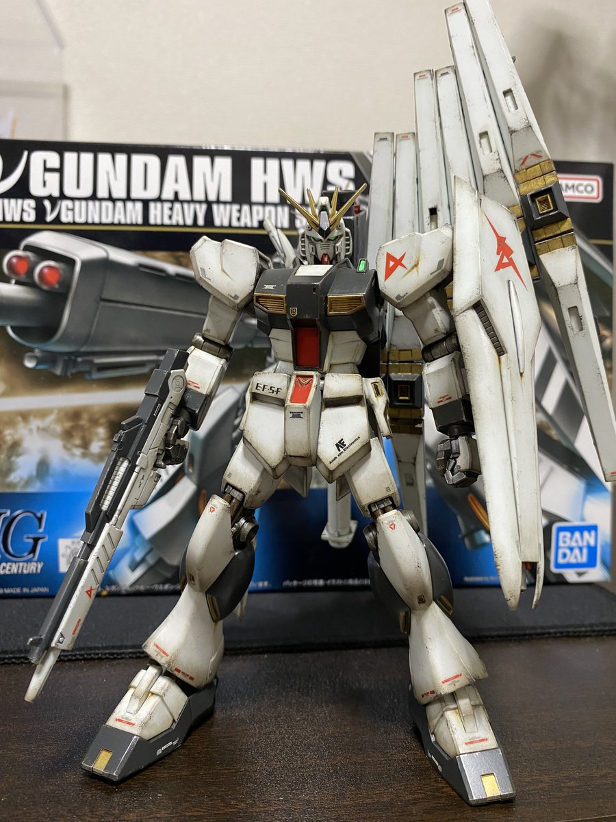 HGUCのνガンダムのヘビーウェポンシステム!を成型色でウェザリング! HWSはつや消しトップコートからの、汚して、つや消しで締め! 本体は半光沢なんだけど、写真だと違いがあまり分からないな、、、 後、ポージングが全然できぬ、、、 #ガンプラ #gunpla #ガンプラの画像を貼るとRTされると聞いて