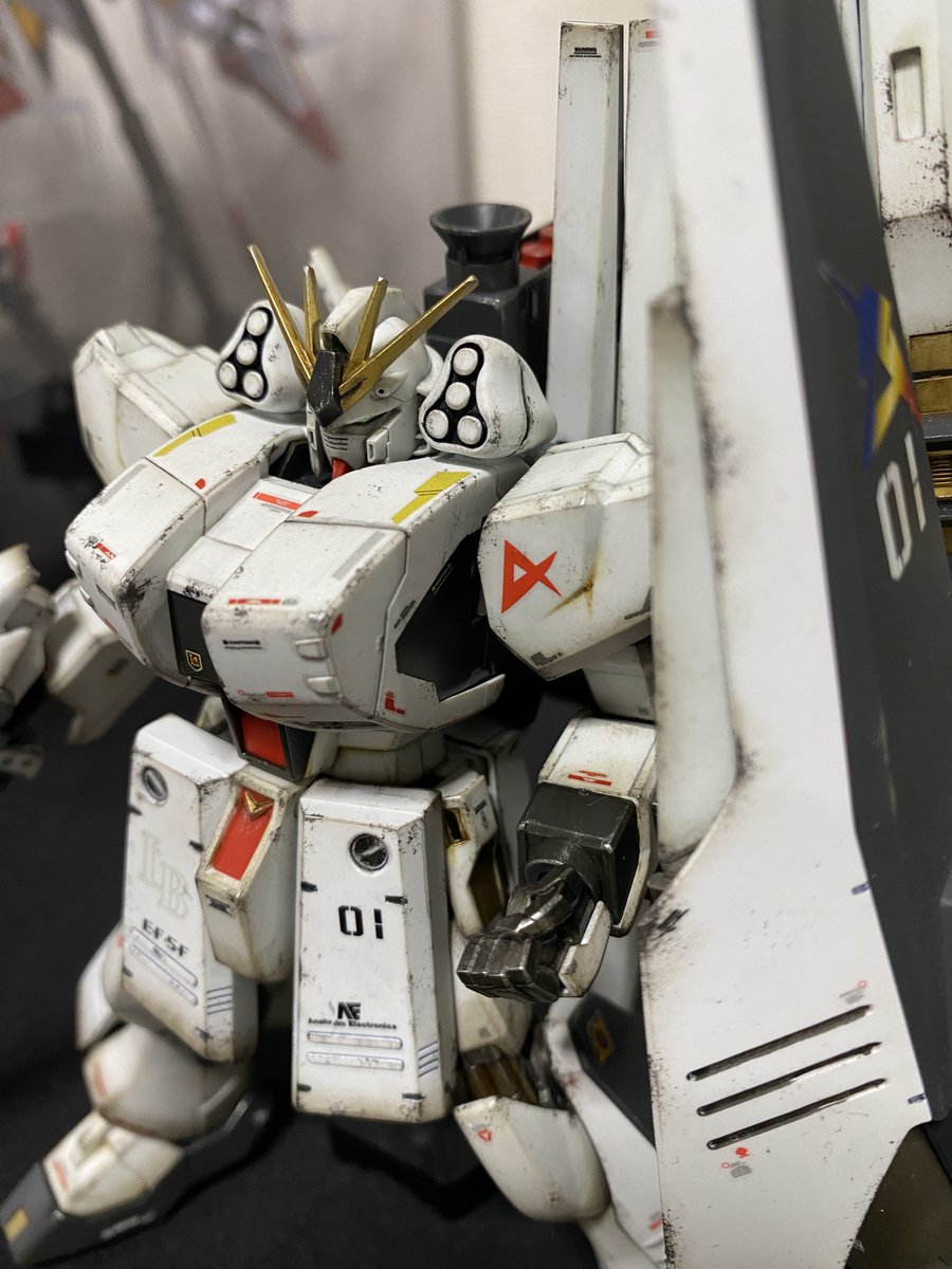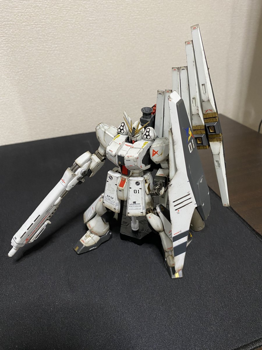 HGUCのνガンダムを成型色でウェザリング!半光沢で仕上げてますッ! スポンジチッピングが初だったので少し汚くし過ぎたかも、、、 シールドとファンネルの汚し具合は個人的に上手くいったかなと思うので、今後はこの感じを参考にしよー! #ガンプラ #gunpla #ガンプラの画像を貼るとRTされると聞いて