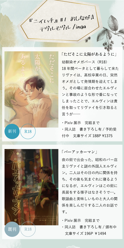 同人誌「ただそこに太陽があるように」 とらさんで予約開始しました! ec.toranoana.jp/joshi_r/ec/ite… 幼馴染オメガバース 文庫サイズ188P、漫画4P、挿絵6枚 3/25~「ニイハチ」で完結まで公開予定。本の書き下ろしは発情ノット有ラブラブせっくす♡ 5月の超壁博に持っていきます。 #eruri #エルリ
