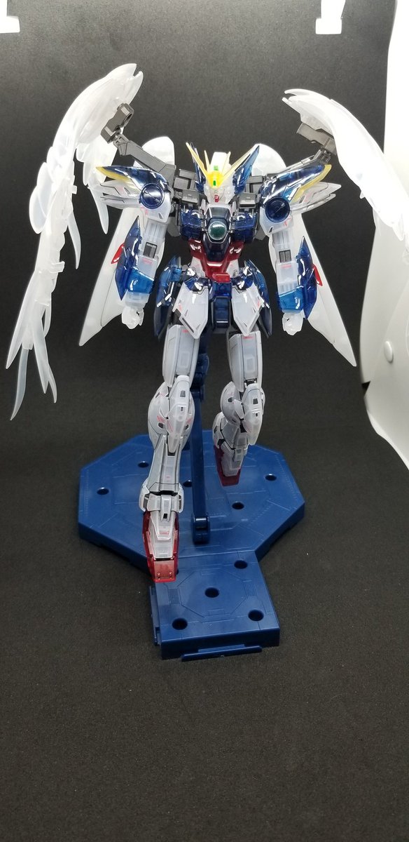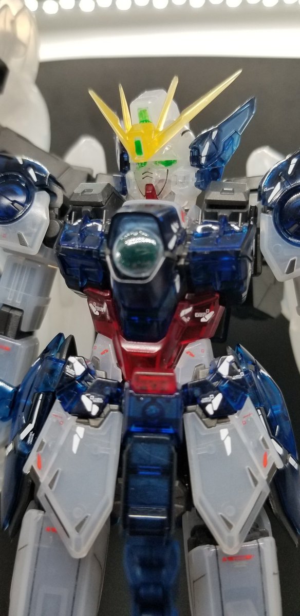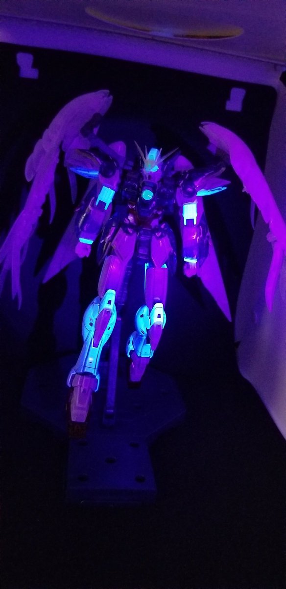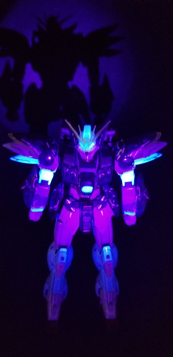 クリアバージョンのウイングゼロEW完成😆🎉🎉 武器のデカールはこれからだけど笑 せっかくなのでブラックライトで光らせてもみました🎵 下の投稿で全体動画も載せておきます( ´∀`) #ガンプラ #ウイングゼロEW #ガンプラ好きな人と繋がりたい
