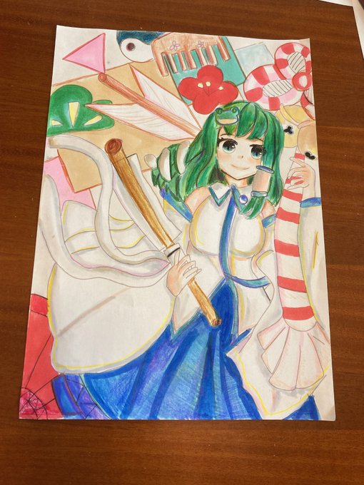 #アナログイラスト #アナログ絵を流してアナログ民を増やそう #コピック #コピックイラスト #東方イラスト #イラスト #イラスト好きな人と繋がりたい #いいね返し 手が写ってたので上げ直し😱😱 サナエサン!!線画配布してるのでぜひ!誰か塗ってー