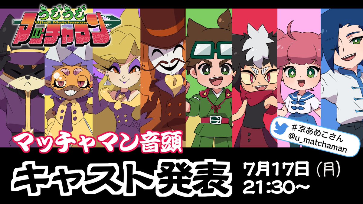 \\🌟#拡散希望🌟// ついに‼️‼️ 📺7月17日(月)21:30〜 【マッチャマン音頭】の キャスト発表をおこないます❣️🎉 編曲してもらったインスト聴けます! キャラ全員の台詞💬もちろん聴けます! youtube.com/live/VibDHuZEg… 見に来てくれーッ!!✨✨✨ #うじうじマッチャマン #京あめこ