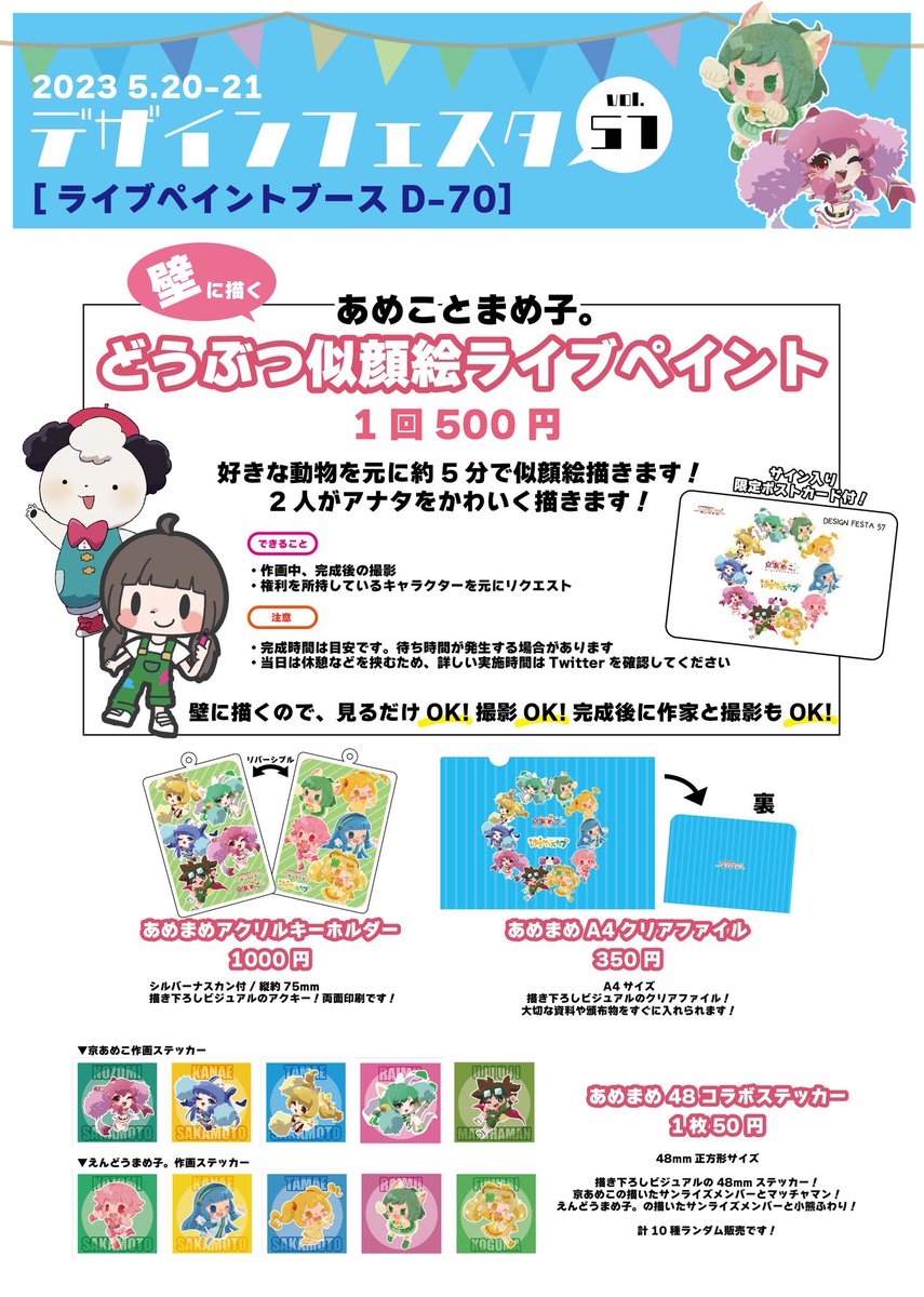 ✨🍭コラボライブペイントのお知らせ🫘✨ アニマル可愛い似顔絵描かせてください! 描いてるとこの動画・撮影OK❣️ 2023年5月20.21日 【#デザインフェスタ57 】 D-70 ブース『塗料屋@サンライズ』様 お声がけいただきありがとうございます‼️✨ コラボグッズも多数です‼️ よろしくお願いします‼️‼️