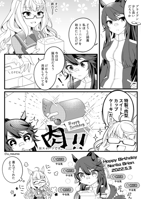 101 371 ブライアンさん、お誕生日おめでとうございます!!お肉たくさん食べてほしい…!🍗🍖🥩 #ナリタブライアン生誕祭2022 #ウマ娘 22/05/03 20:35