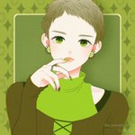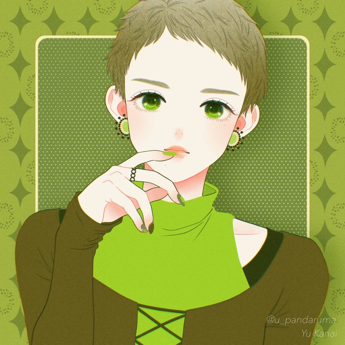 個展展示作品⑥ OYASAIGIRLS 「キウイ」 #その彩りに恋をする #ピクルスアート展 個展の描き下ろしイラストです。 酸味、皮の産毛、美容。 かっこいい女性が浮かんだのでいつもと違った雰囲気で描きました。 ピアスは種を含めたキウイの中心部。 髪型はベリショで皮の部分を表現しています☺️