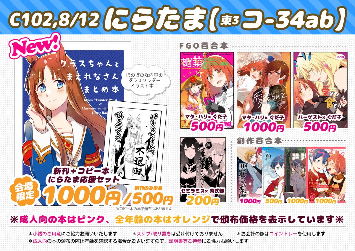 #C102 お品書きです!新刊はグラスワンダー本、既刊でFGO百合本/創作百合本などを持っていきます! 🟢webカタログ webcatalog-free.circle.ms/Circle/17309682 #C102お品書き