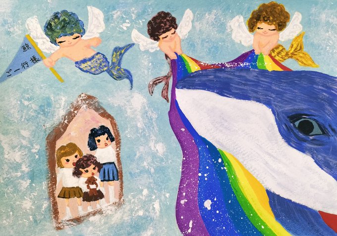 0 6 お絵描き🖌 くじらさん🐳が、人魚の天使に七色の波で運んでもらって、家に遊びにくる、という長女のみた夢(◍•ᴗ•◍) 今年は絵が上手くなるように頑張りたいなぁ… #水彩 #アクリルガッシュ #絵描きさんと繋がたい #お絵描き練習中 22/01/05 01:03