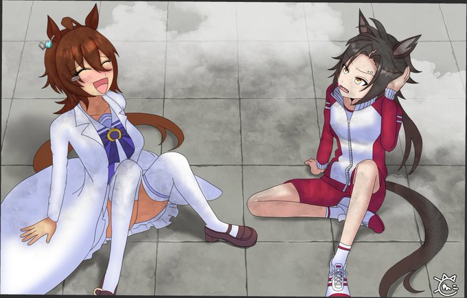 タ「いやぁ、失敗、失敗派手に爆発したねぇ」 シャ「どーすんだよ、後始末」 実験大失敗なタキオンとシャカール描いてみました! #ウマ娘 #アグネスタキオン #エアシャカール