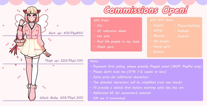 COMMISSIONS OPEN! Five slots only😊 💌 Please provide paypal email so I can send you an invoice 💌 ETA: 2-3weeks or less 💌 See thread to see my previous works 💌 RTs are highly appreciated! Thank you! #artph #commissionsopen #artshare #digitalart #pinkart #Commission