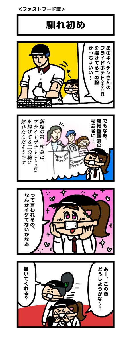 64 699 【1年前の4コマシリーズ】第12弾 ファストフード篇です。 タイトル【馴れ初め】 息抜きにどぞー。 #モモウメ 20/06/17 14:00