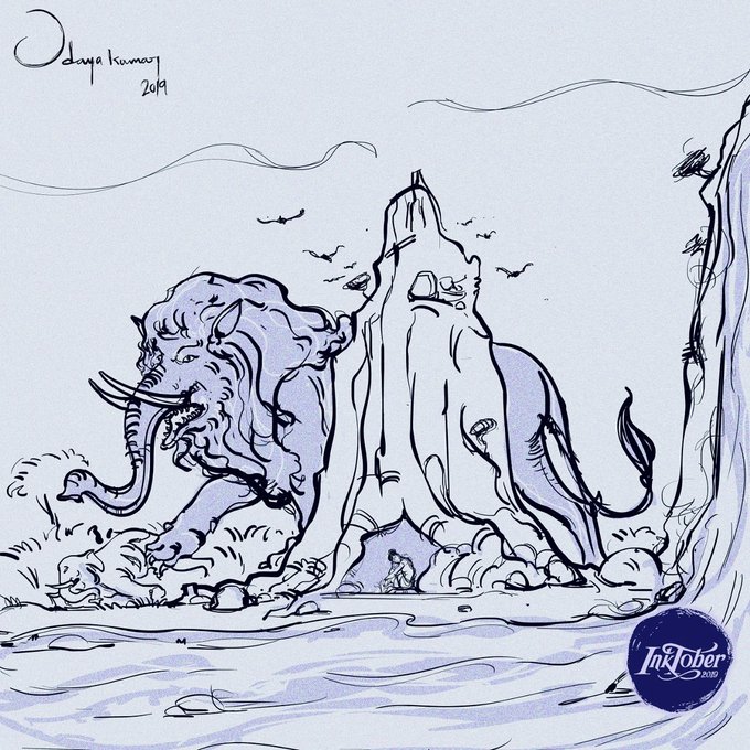 #inktober #inktober2020 - Day 3 - #bulky திருக்குறள் - பொருட்பால் . பரியது கூர்ங்கோட்டது ஆயினும் யானை வெரூஉம் புலிதாக் குறின். (குறள் 599) Huge bulk of elephant with pointed tusk all armed, When tiger threatens shrinks away alarmed! #thiruvalluvar #wacomintuos #adobephotoshop
