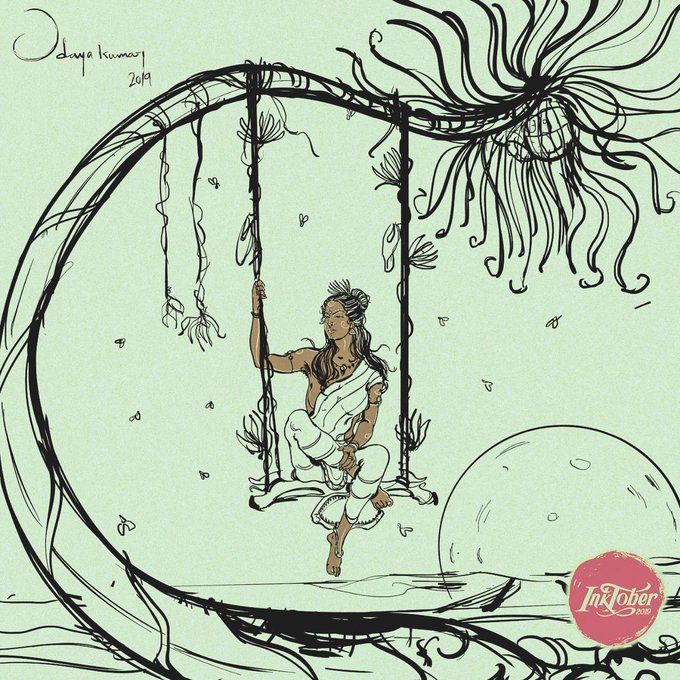 #inktober #inktober2019 -Day 9 'swing' 'ஊசல்' இனமீன் இகல் மாற வென்ற சின மீன் எறி சுறா வான் மருப்பு கோத்து நெறி செய்த நெய்தல் நெடு நார்ப் பிணித்து யாத்துக், கை உளர்வின் யாழ் இசை கொண்ட இன வண்டு இமிர்ந்து ஆர்ப்பத், தாழாது உறைக்கும் தட மலர்த் தண் தாழை வீழ் ஊசல் தூங்க பெறின்.(கலி131)