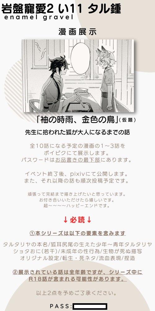 タル鍾 先生に拾われた🦊が大人になるまでの話 2/19のwebイベントで展示しておりました。続きます。 ※本シリーズは色々な要素が含まれますのでキャプションをご一読ください。 1話→pixiv.net/artworks/10560… 2話→pixiv.net/artworks/10560… 3話→pixiv.net/artworks/10560…