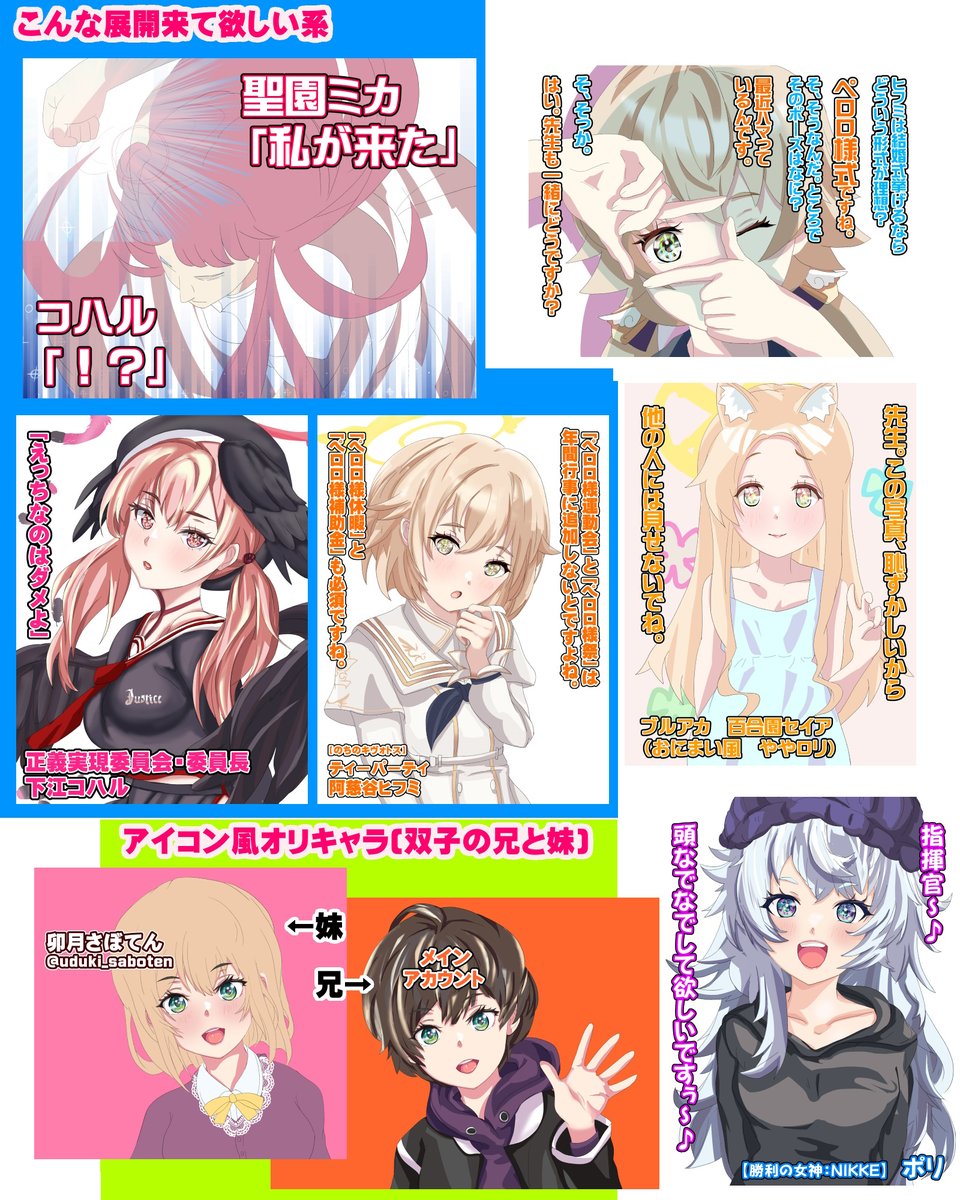 #今月描いた絵を晒そう 枚数が結構あるので、一部をピックアップしました。今月も沢山のイラストを見て下さってありがとうございました~! 1枚目:ブルアカ(ホシノ、ハナコ、カズサ、ミネ団長) 2枚目:FA(ブルアカ系) 3枚目:FA(配信者さん) 4枚目:ブルアカ、NIKKE、オリキャラ等 #ブルアカ