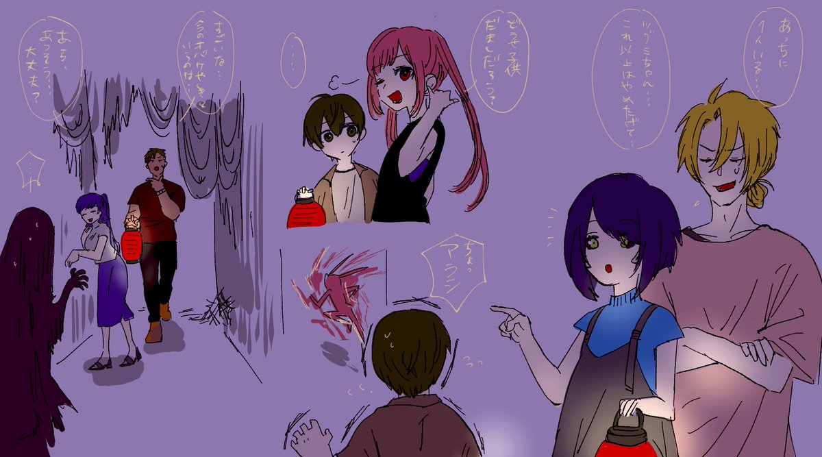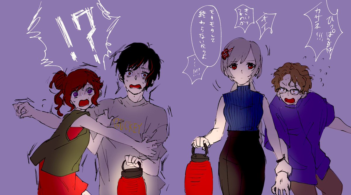 25 63 #スカネク座談会 おつかれさまでしたー!! 夏イベント、水着浴衣じゃないですが聴きながらお化け屋敷に入るスカネク好き男女組を描きました…😂🙏 22/07/29 00:25