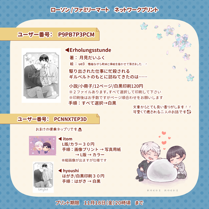 🌟ネットプリントのお知らせ🌟 月見だいふくさんの素敵ギル菊小説に、僭越ながら表紙と挿絵を描かせて頂きました🙌とてもニヨニヨなお話なので、是非是非プリントして下さい🍵 便乗してイラストのネットプリントも登録しました。よろしければついでに~。はがきの印刷具合が良い感じでおすすめです☺