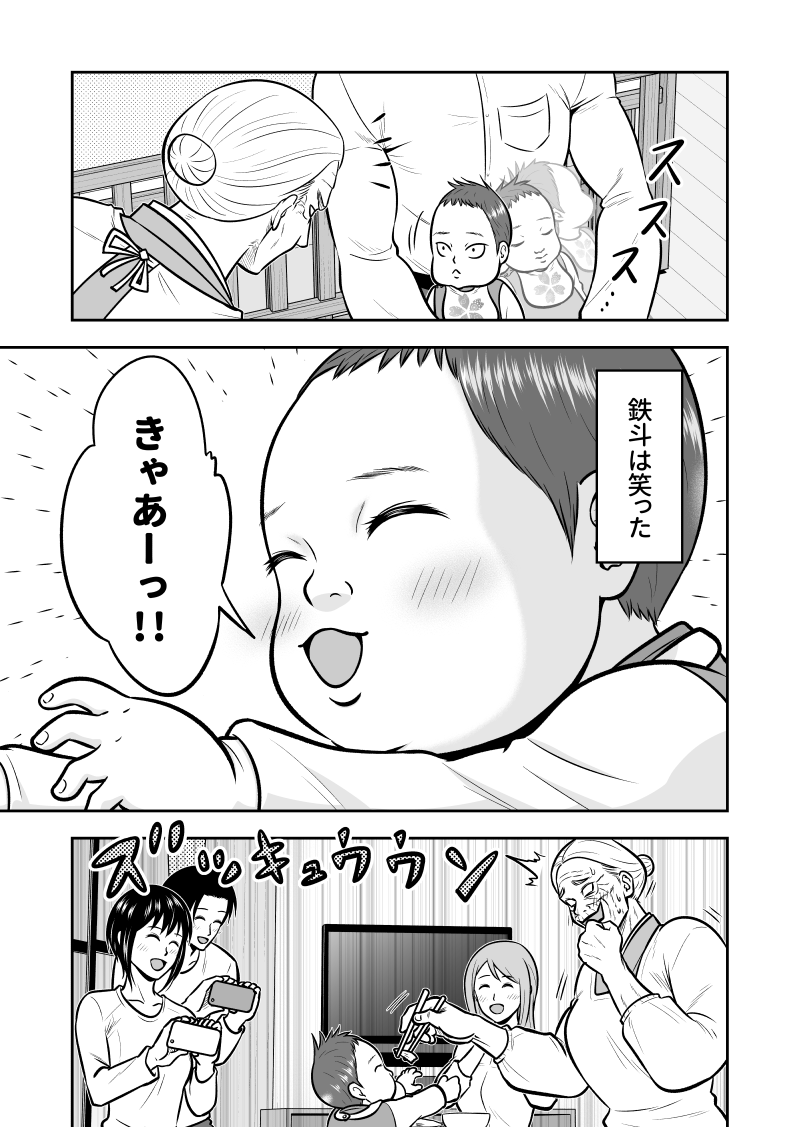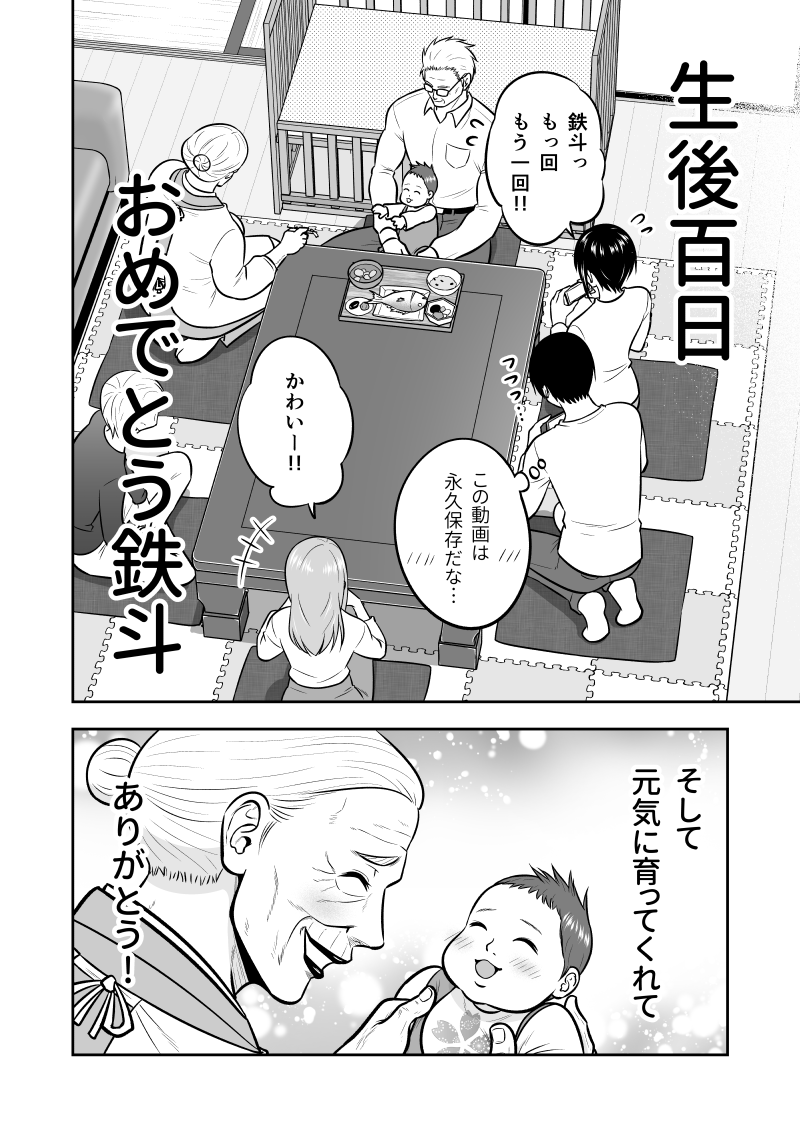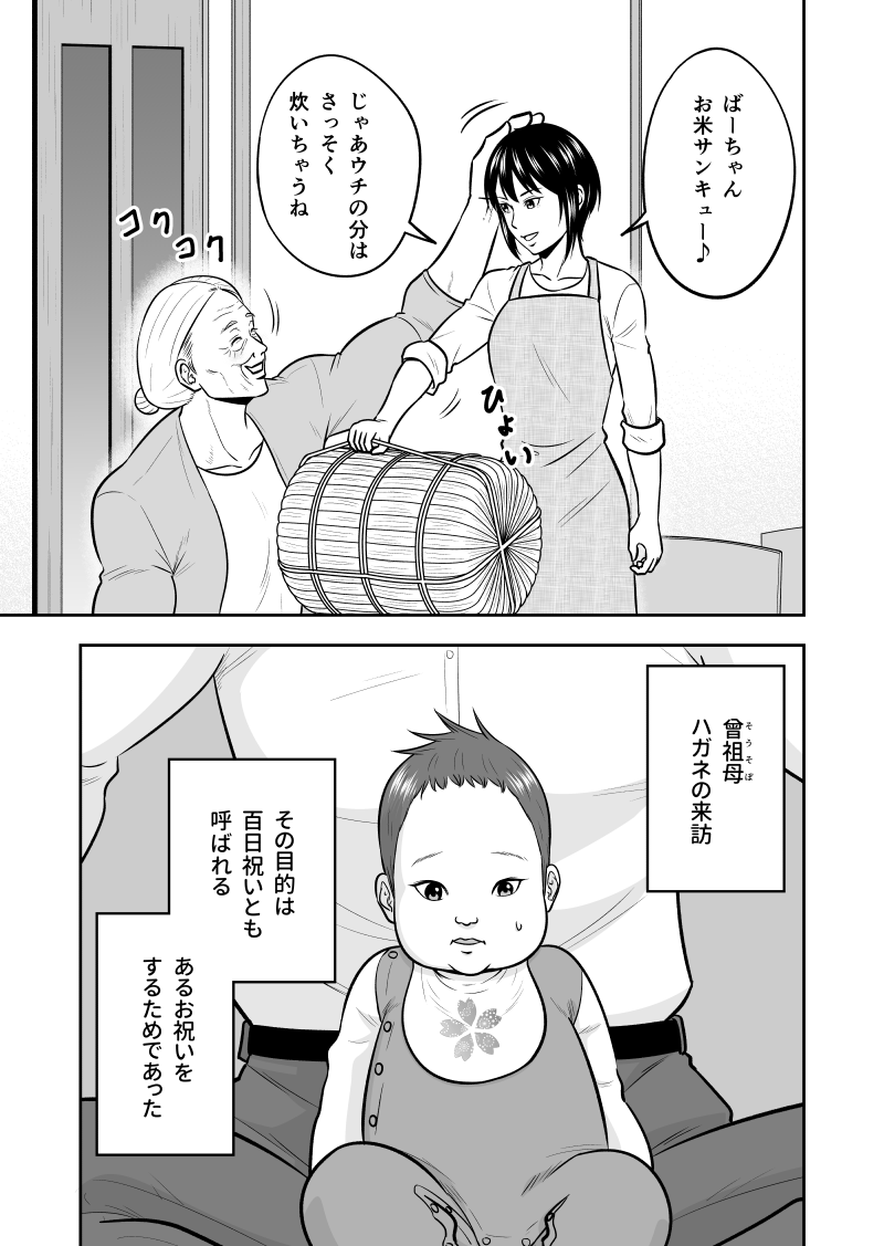 たくましすぎるお婆ちゃんが、ひ孫の百日祝いに飛んでくる話 1/4