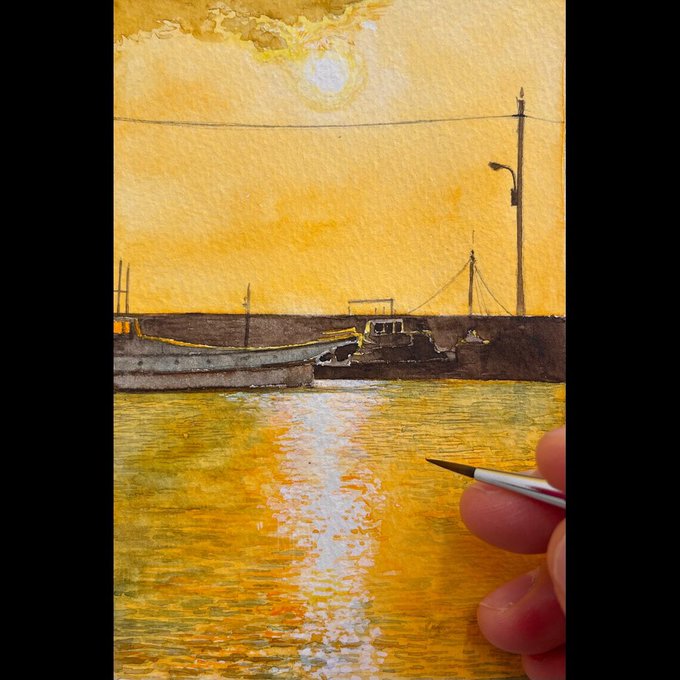 0 11 【制作中】千葉県富津市の港です。10月に行った際に写真に収めましたので、それを元に描いています。習作。 #水彩 #水彩画 #港 #夕陽 #富津市 #千葉 #船 #海 #sunset 21/11/18 20:41