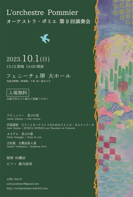 4 7 オーケストラ・ポミエ第9回演奏会🍎 デザインを担当したチラシとアイコンとヘッダー🎨 演奏会は10月1日(日)です!ぜひ! #デザイン #コンサートチラシ #鳥 #吉松隆 #水彩 23/05/17 16:32