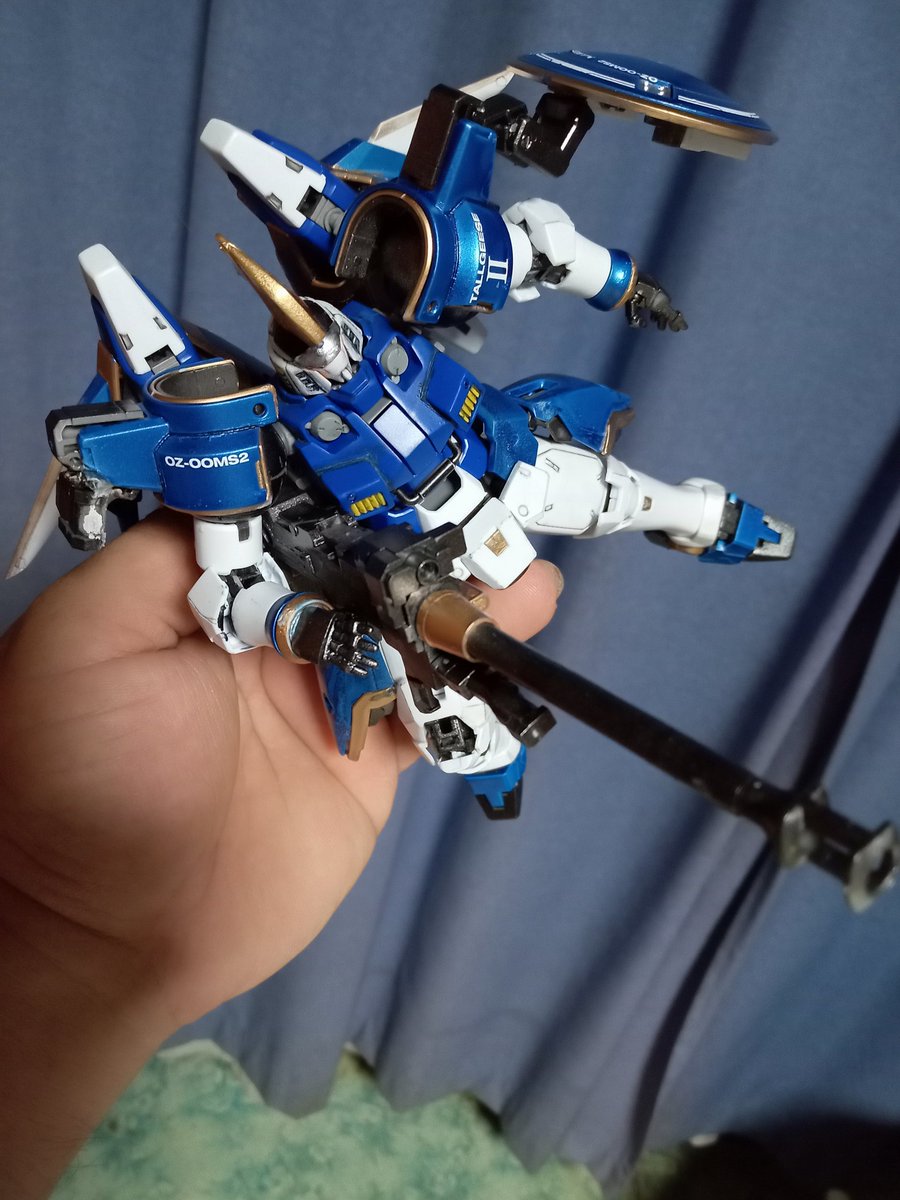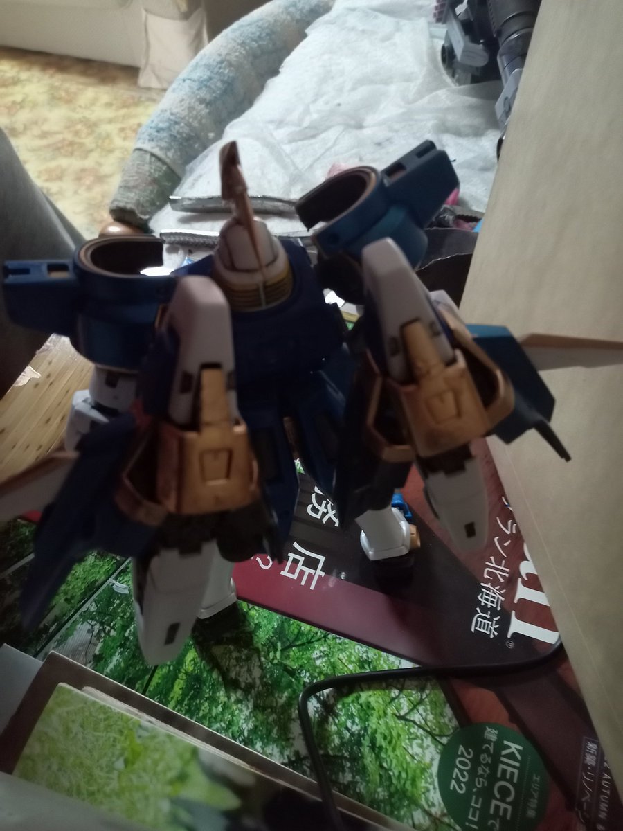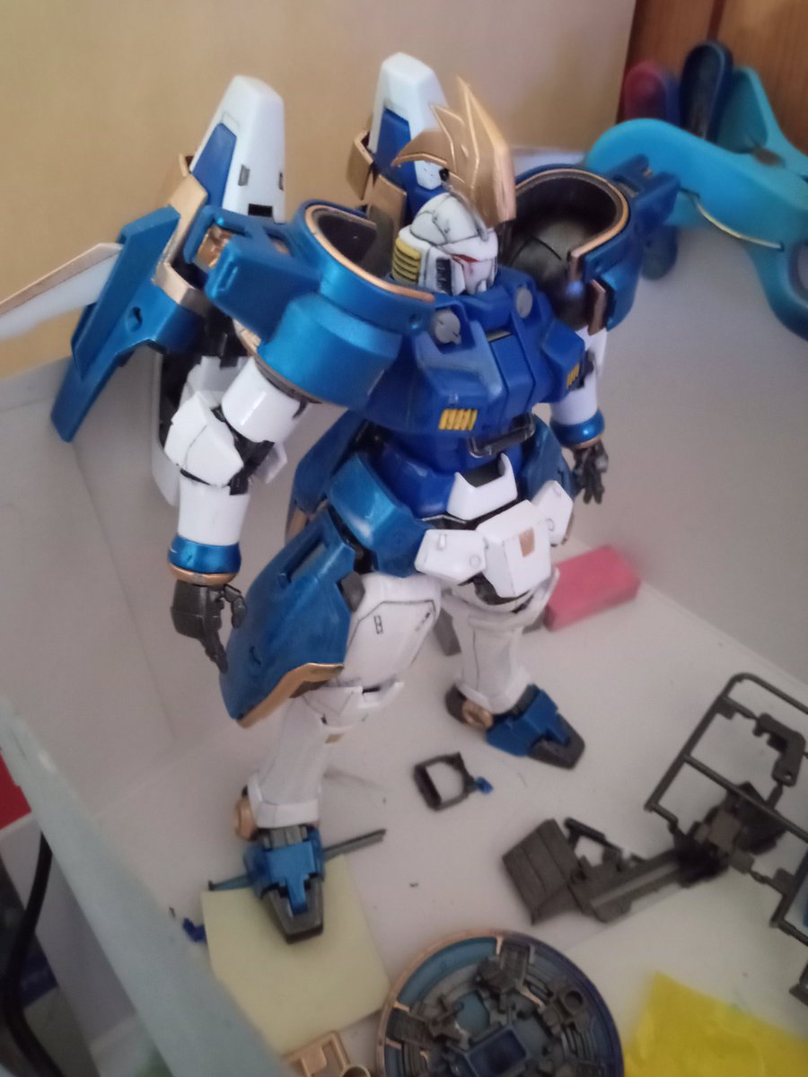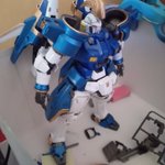#ガンプラは自由だ #ガンプラの画像貼るとRTされると聞いて mgリゼル改リゼガイムマーク2です🤣ただの思いつきでフルアクションエルガイムマーク2の頭だけいただきました。自重で直立出来ません(笑)