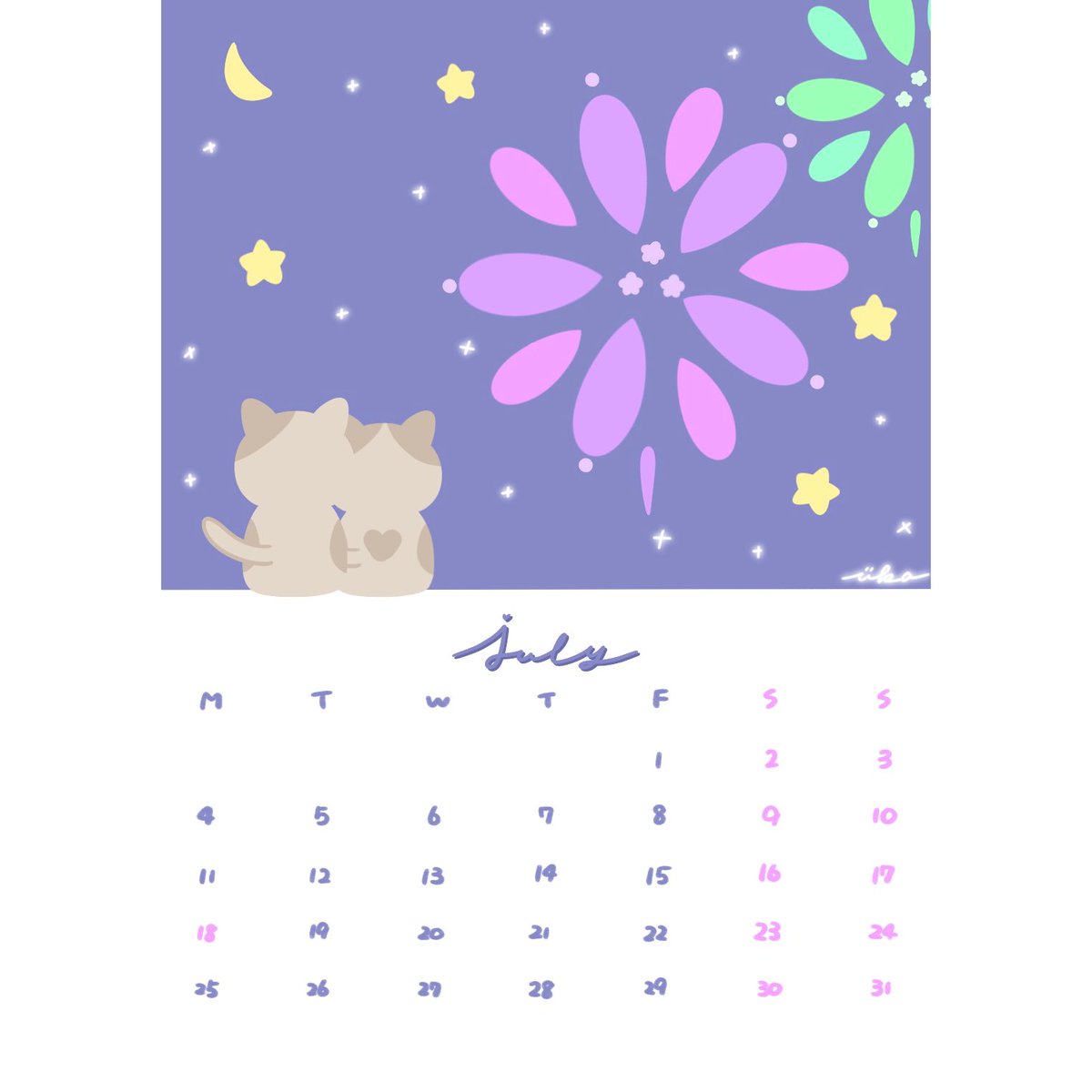 #ukaのフリーイラスト 7月のカレンダー壁紙が出来たよ〜✨ 今月は花火×ねこちゃん🐈🫧 昨日配布したカレンダーとおそろいなので是非セットで使ってみてね🤍 #カレンダー壁紙 #壁紙配布 #イラスト #illust #illustration