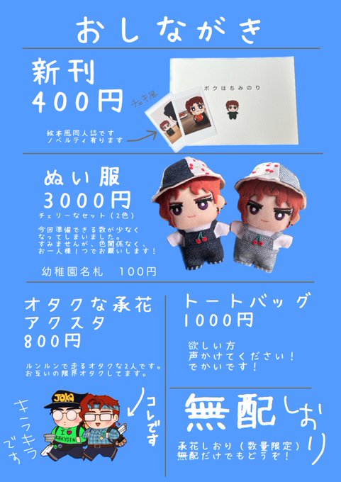 ⭐️8/6のお品書き🍒 とりあえず作りました!雑ですみません😭! ・新刊については引用RT元をご確認ください! ・ぬい服、グッズ等の詳細やお願いなどは、このツイートの追加のツイートしていきます!ご確認ください! twitter.com/uka_j0/status/…