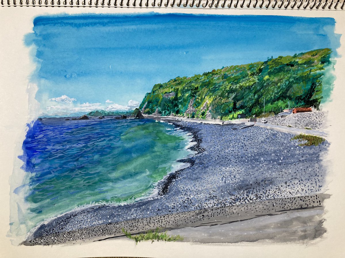 この間寄った海岸です。黒い海岸が印象的でした。 #イラスト #絵 #水彩 #水彩画 #風景画 #海