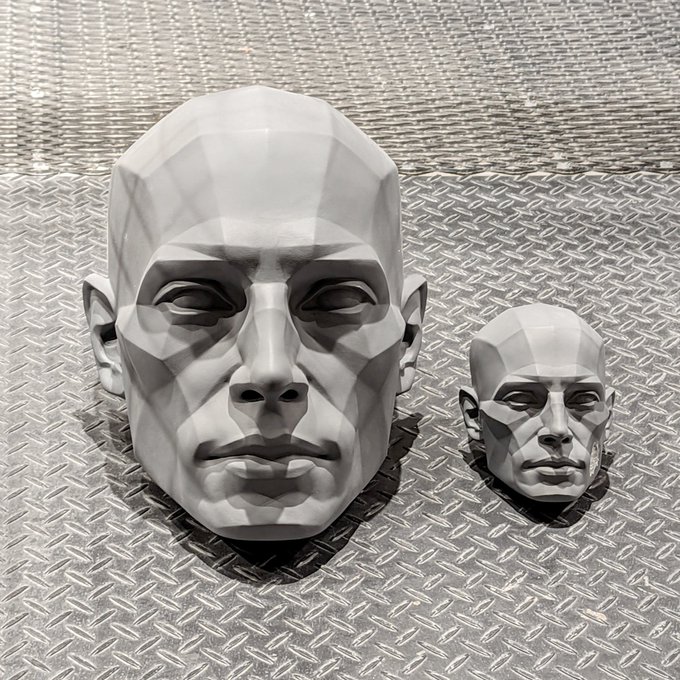 【ポリヘドロンマン】 胸像だったものを頭部のみにしてサイズアップしました。顔のサイズは15センチ。 販売はこちらから→ goushiart.thebase.in/items/26669771 ヒトの彫刻学習用アイテム バランス、奥行き、外連味を知るためのものではありますが、 インテリアアートとして活躍してくれてもとても嬉しいです👽